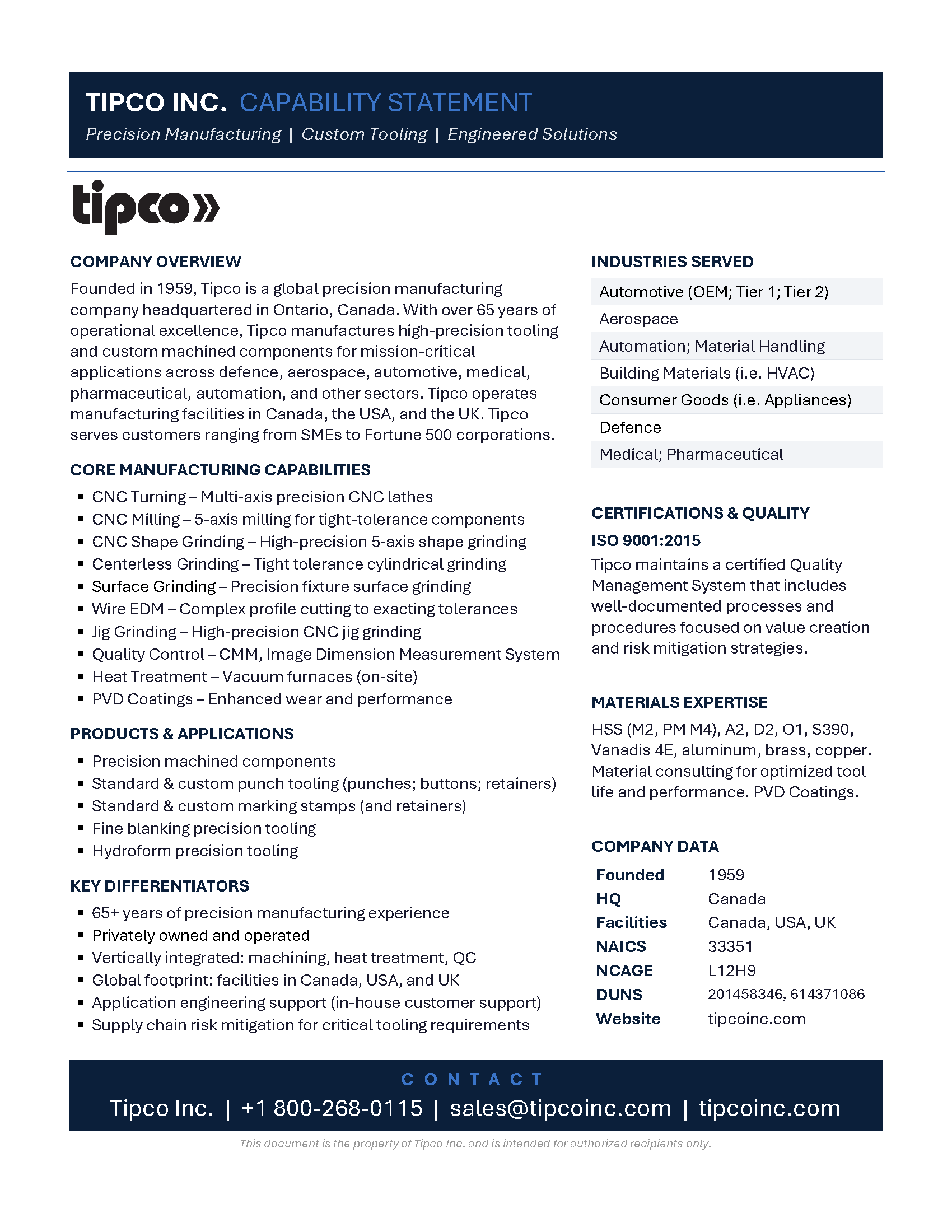 Founded in 1959, Tipco is a global precision manufacturing company headquartered in Ontario, Canada. With over 65 years of operational excellence, Tipco manufactures high-precision tooling and custom machined components for mission-critical applications across defence, aerospace, automotive, medical, pharmaceutical, automation, and other sectors. Tipco operates manufacturing facilities in Canada, the USA, and the UK. Tipco serves customers ranging from SMEs to Fortune 500 corporations.
